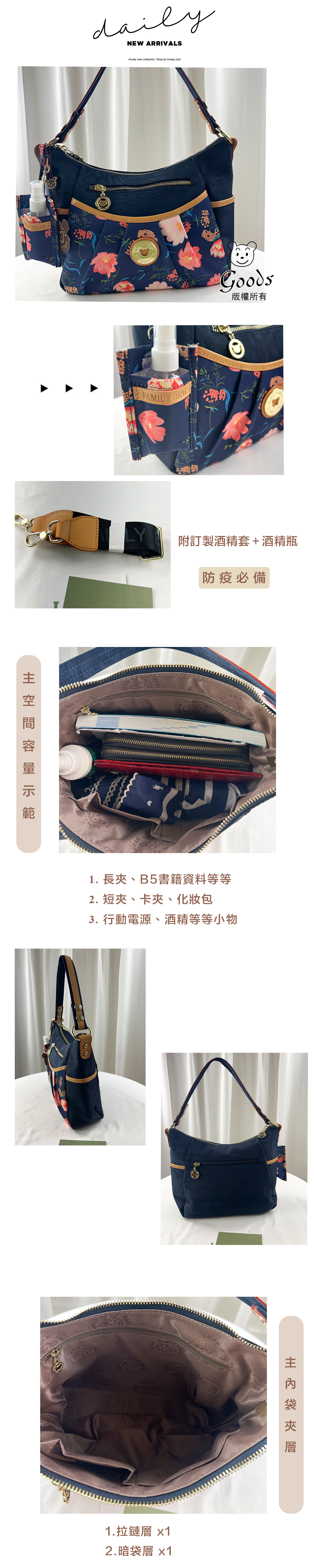 FamilyBear 藍橙花拼色防潑水肩背包 / 側背包 附酒精保護套+酒精瓶 #2636