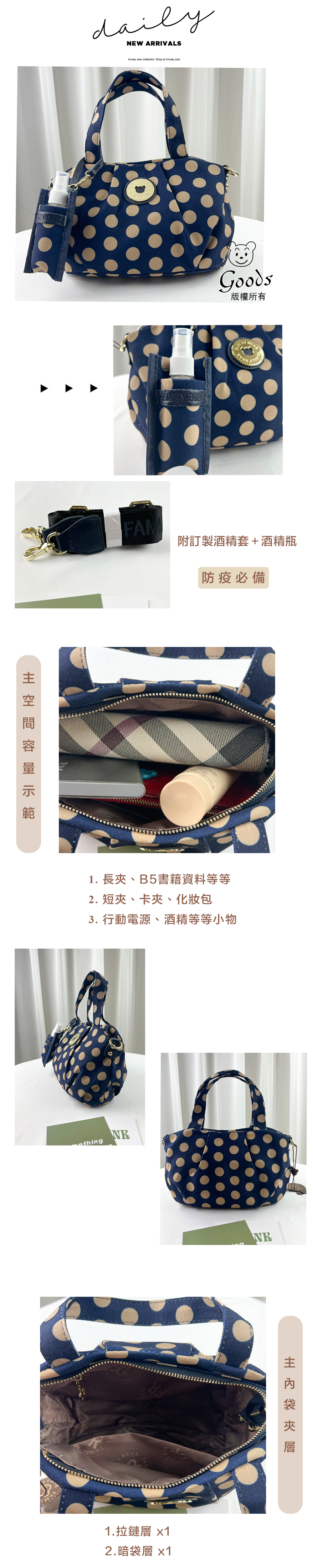 FamilyBear 卡其點點手提包 / 側背包 附酒精保護套+酒精瓶 #2218