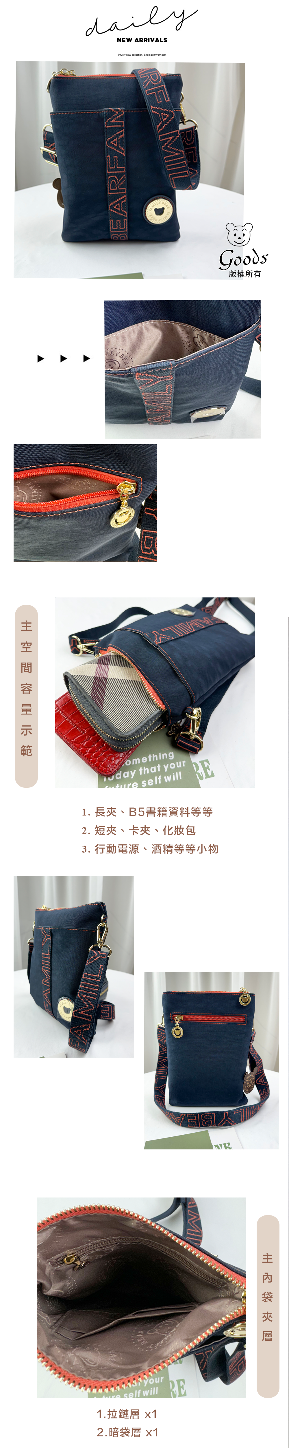 ●  規格:主空間x1  內拉鍊袋x1  暗格x1  前測收納x1  後測拉鍊x1