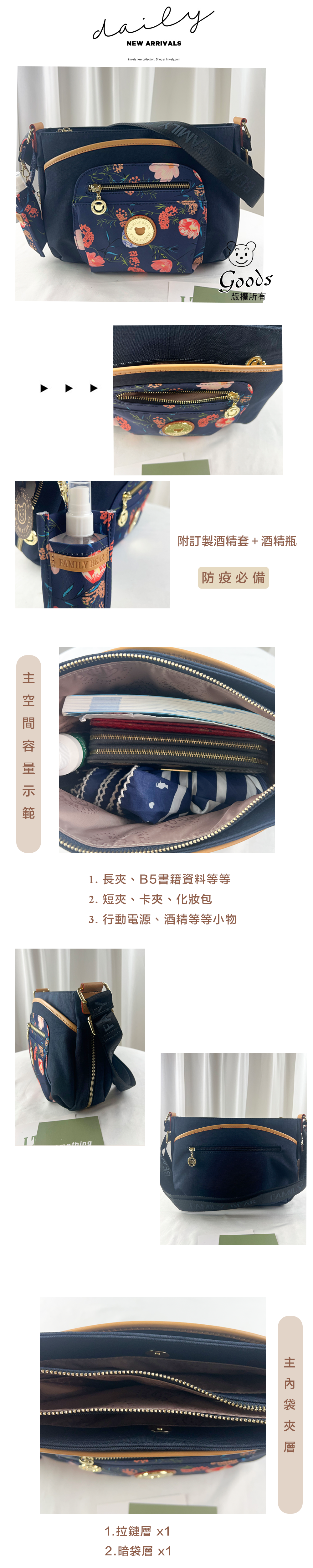 FamilyBear 藍橙花拼色防潑水側背包 附酒精保護套+酒精瓶 #2237