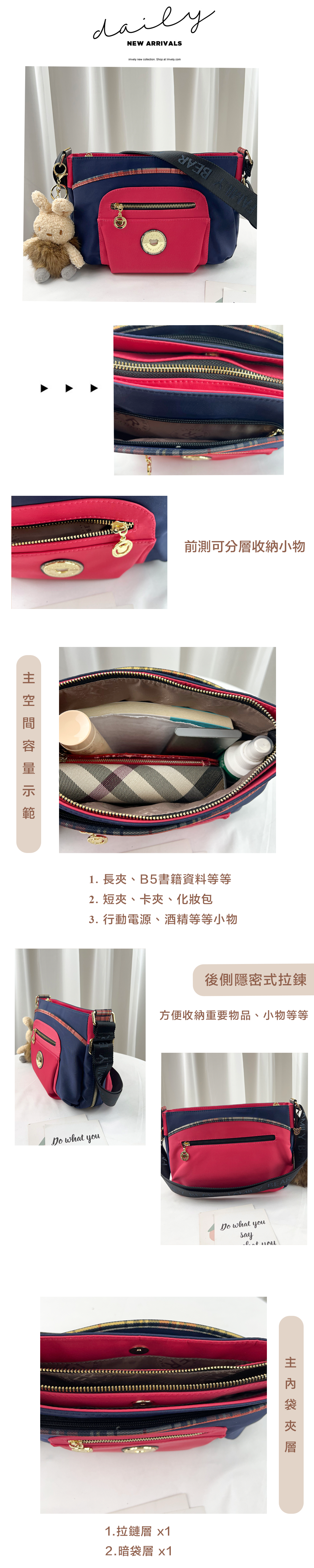 ●  規格:主空間x1  內拉鍊袋x1  暗格x2  前測拉鍊x2  後測拉鍊x2