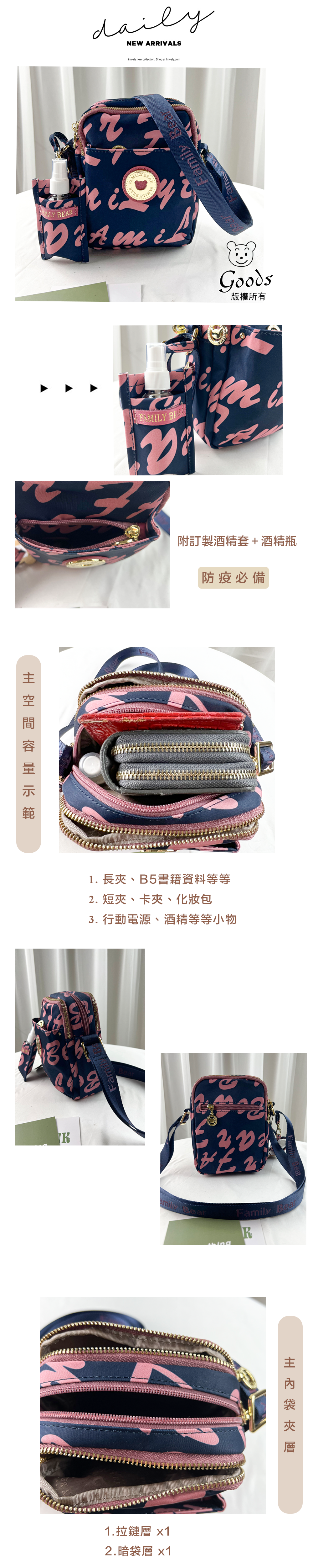 FamilyBear 粉藍拼色字母防潑水側背包 附酒精保護套+酒精瓶 #2499