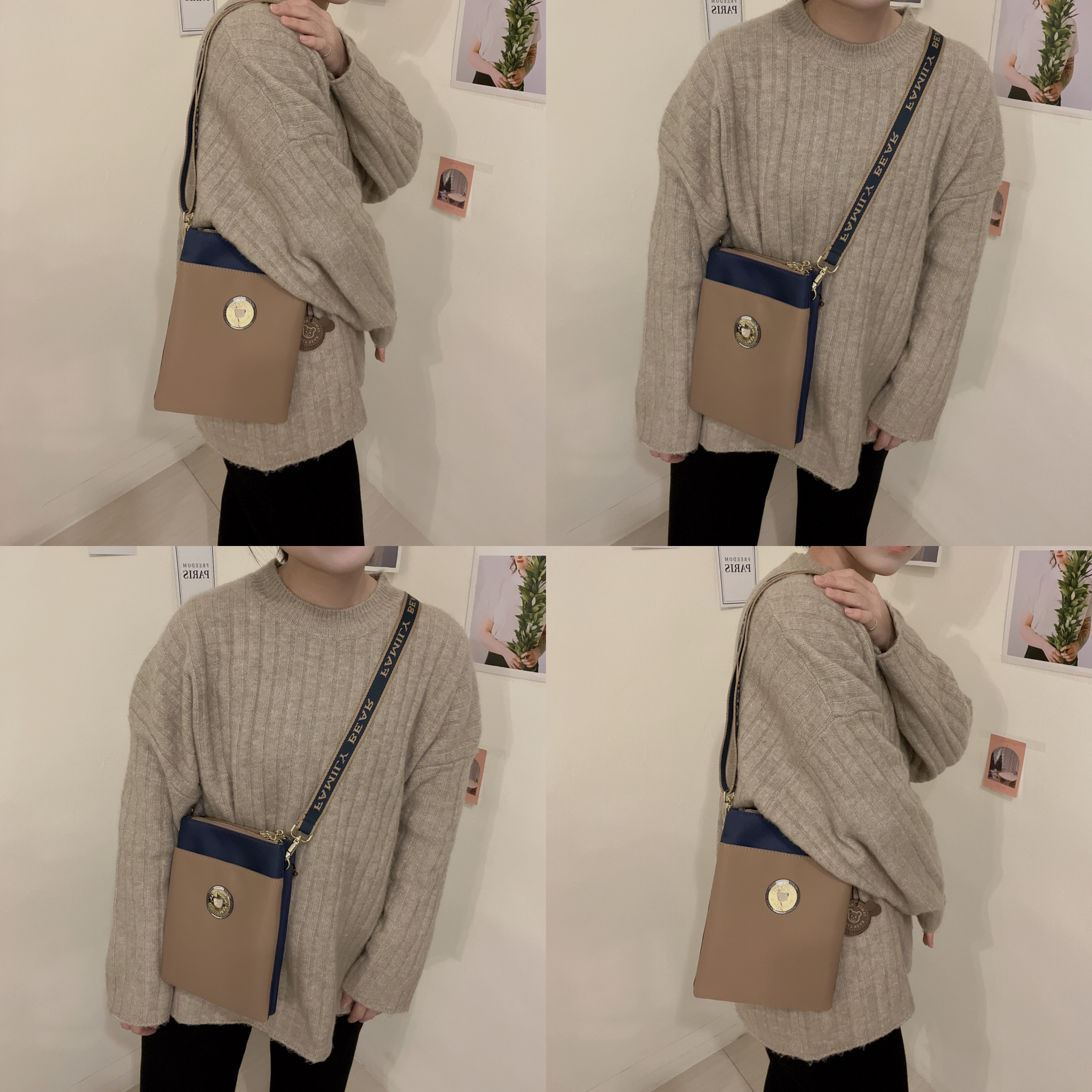 FamilyBear 卡其拼接土耳其藍 防潑水雙層側背包 / 手機袋 #2505-1