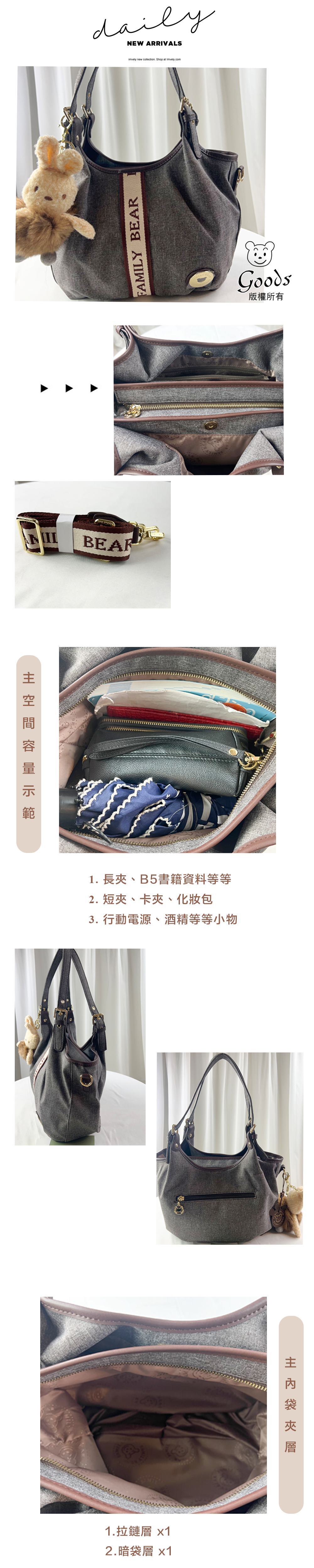FamilyBear 織帶灰配咖防潑水手提包 / 側背包 附兔兔吊飾 #2520
