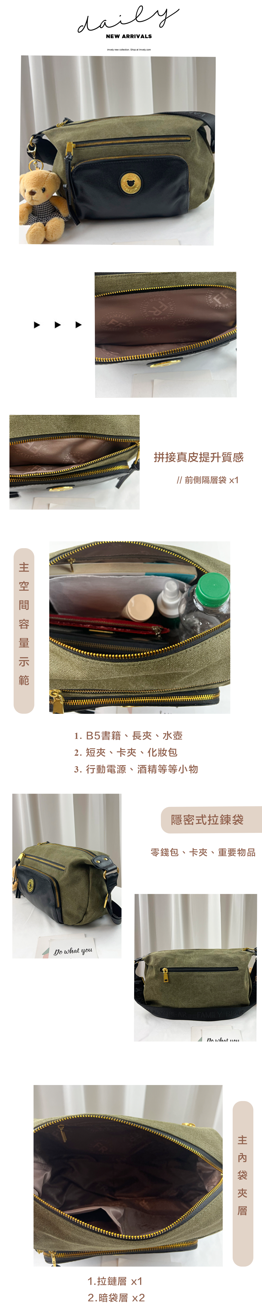 ●  規格:主空間x1  前置收納x2  後測拉鍊x1  內拉鍊袋x1  暗格x2