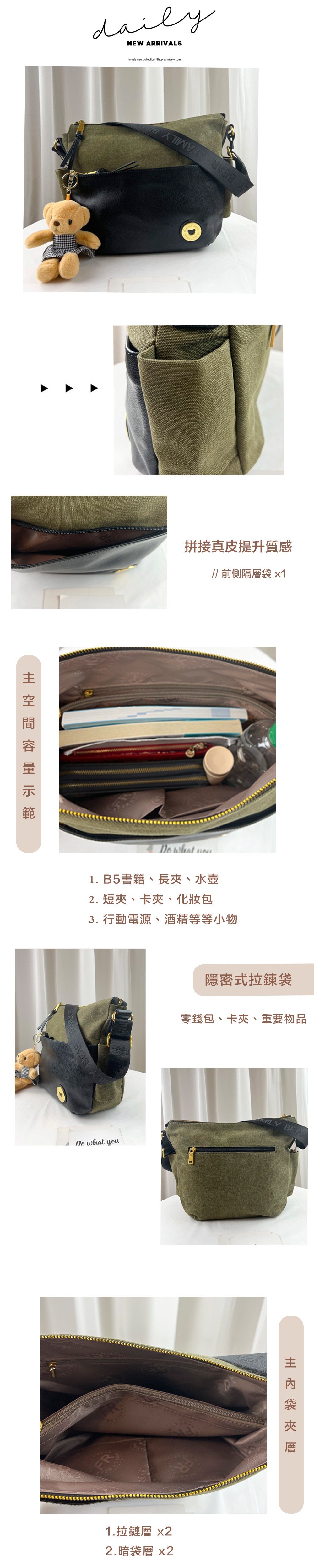 FamilyBear 軍綠帆布拼接真皮側背包 #2533