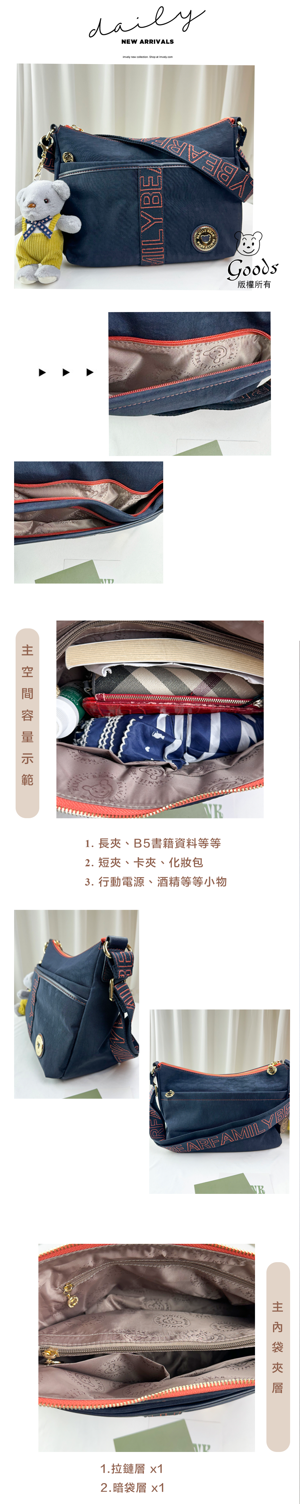 ●  規格:主空間x1  內拉鍊袋x1  暗格x2  前測拉鍊x2  後測拉鍊x2