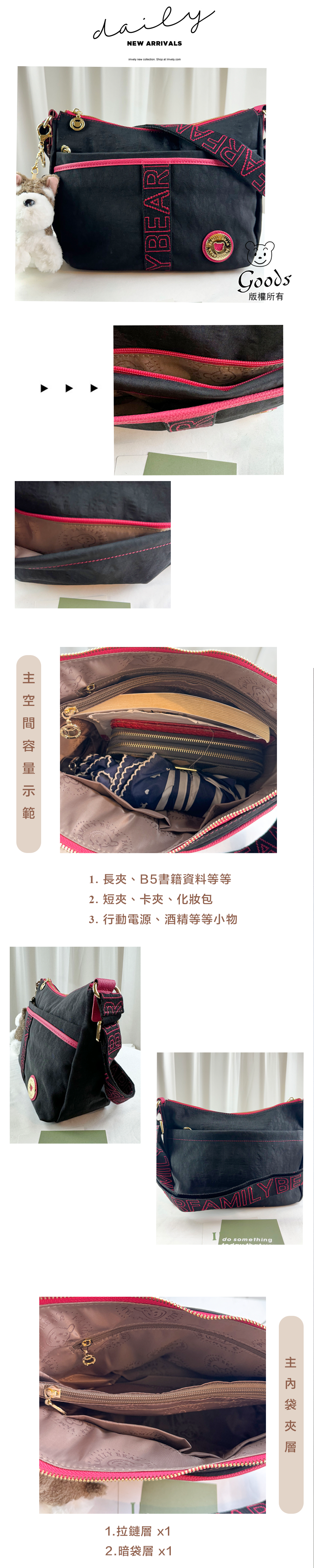●  規格:主空間x1  內拉鍊袋x1  暗格x2  前測拉鍊x2  後測拉鍊x2