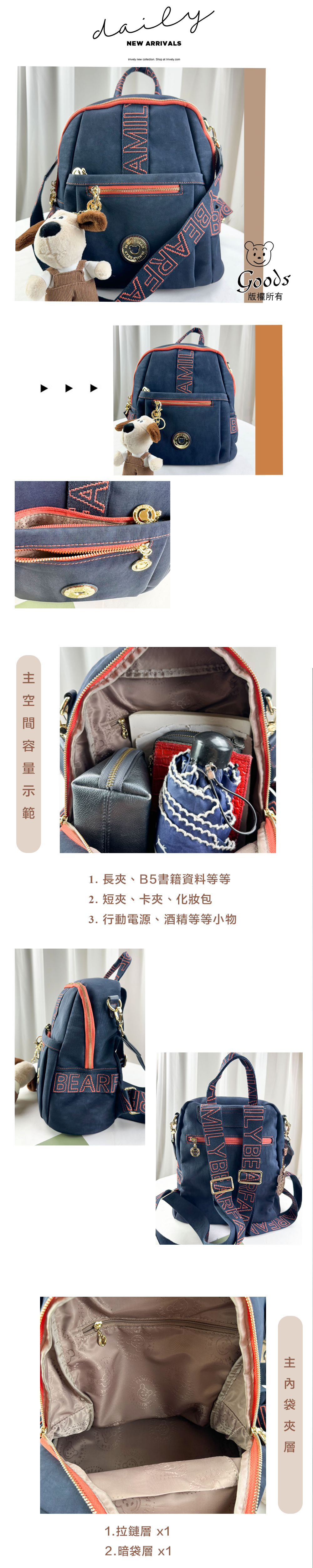 ●  規格:主空間x1  內拉鍊袋x1  暗格x1  前測拉鍊x2  後測拉鍊x1