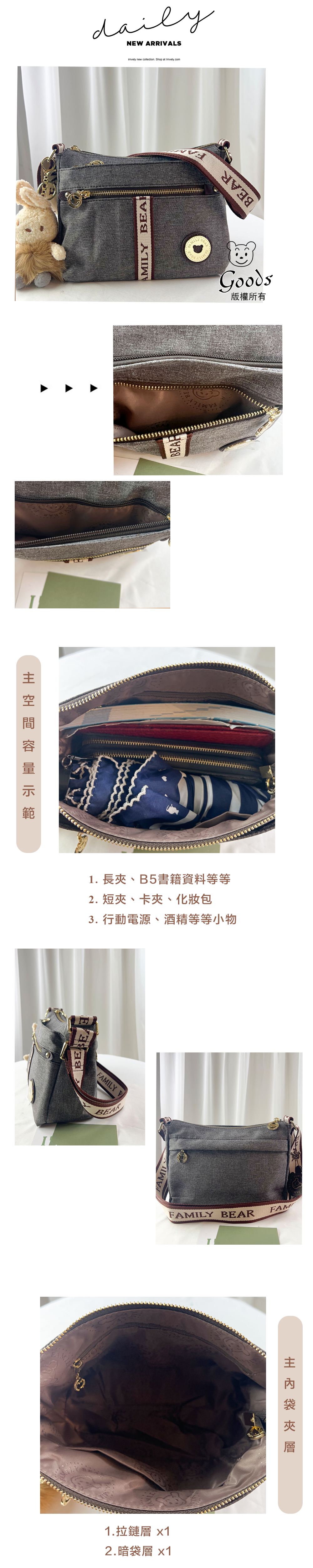 FamilyBear 織帶灰配咖防潑水側背包 附兔兔吊飾 #2672
