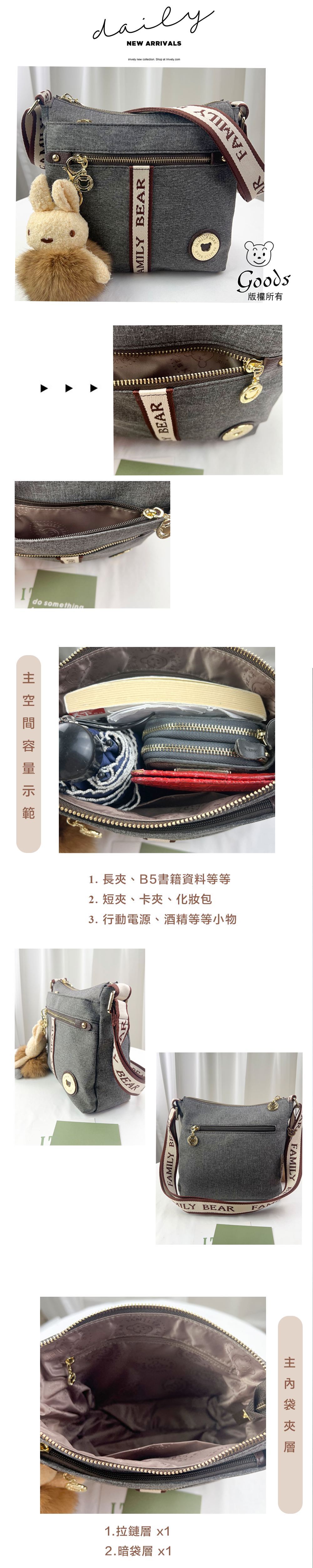 FamilyBear 織帶灰配咖防潑水肩背包 / 側背包 附兔兔吊飾 #2676