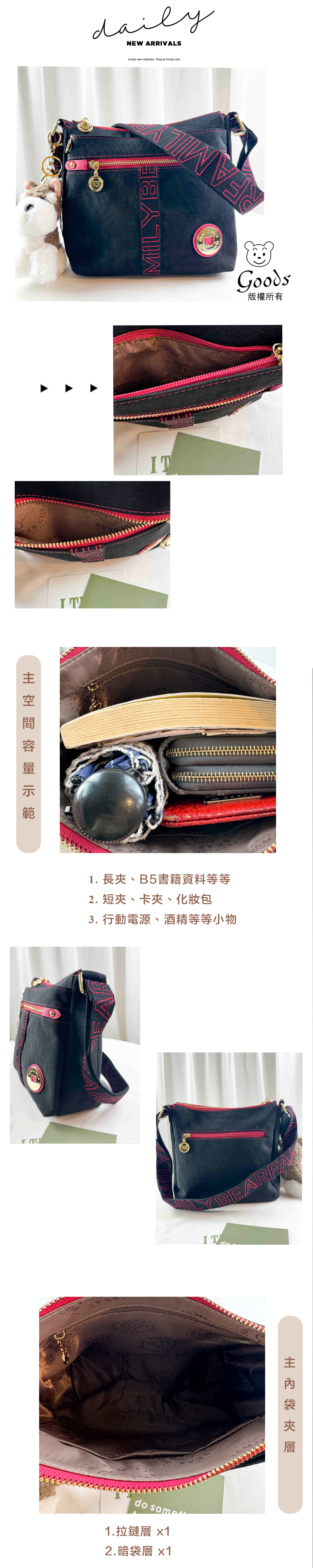 ●  規格:主空間x1  內拉鍊袋x1  暗格x1  前測拉鍊x1  後測拉鍊x1