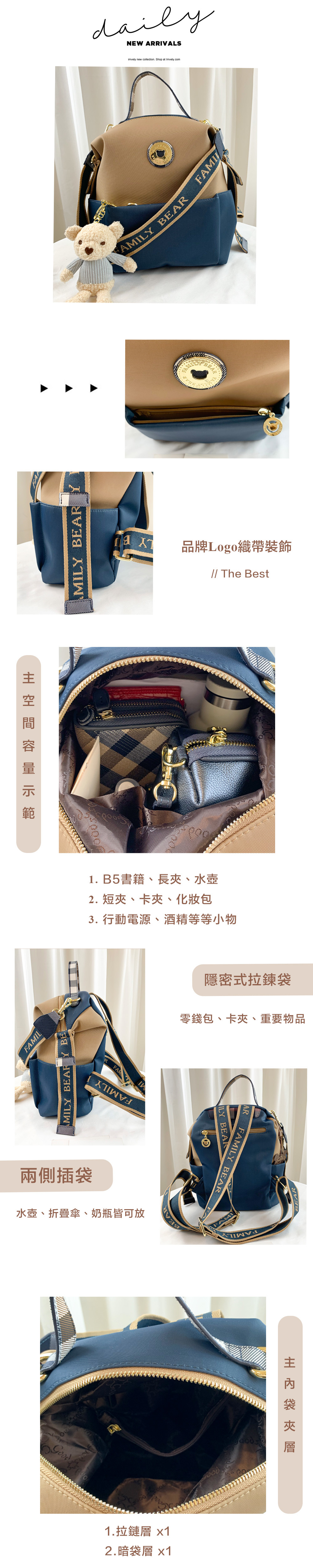 ✒︎採用防潑水布料,不怕下雨淋濕包包內裡重要物品。