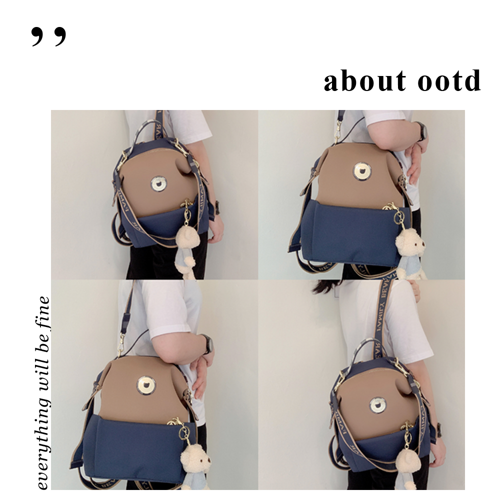 FamilyBear 卡其拼接土耳其藍 防潑水後背包 / 側背包 附小熊吊飾 #2707