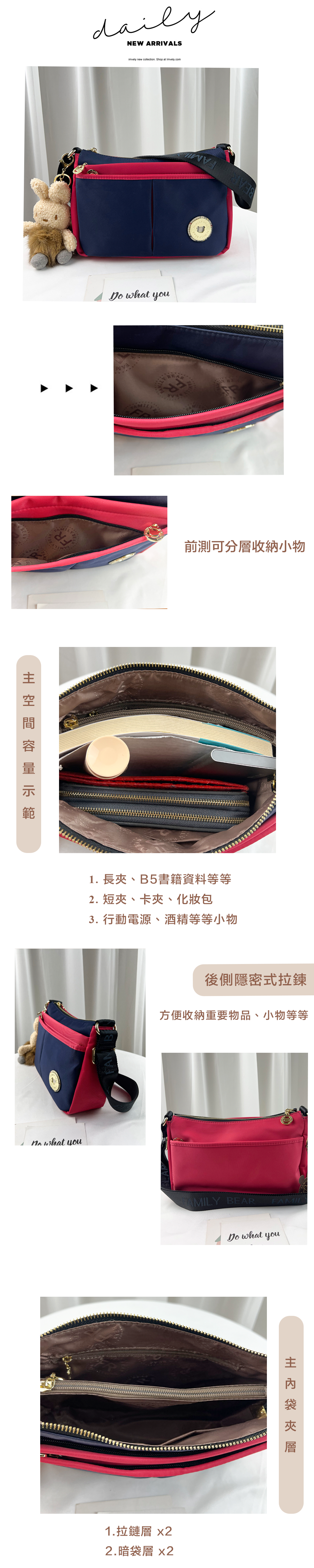 ●  規格:主空間x1  內拉鍊袋x2  暗格x1  前測拉鍊x2  後測拉鍊x1