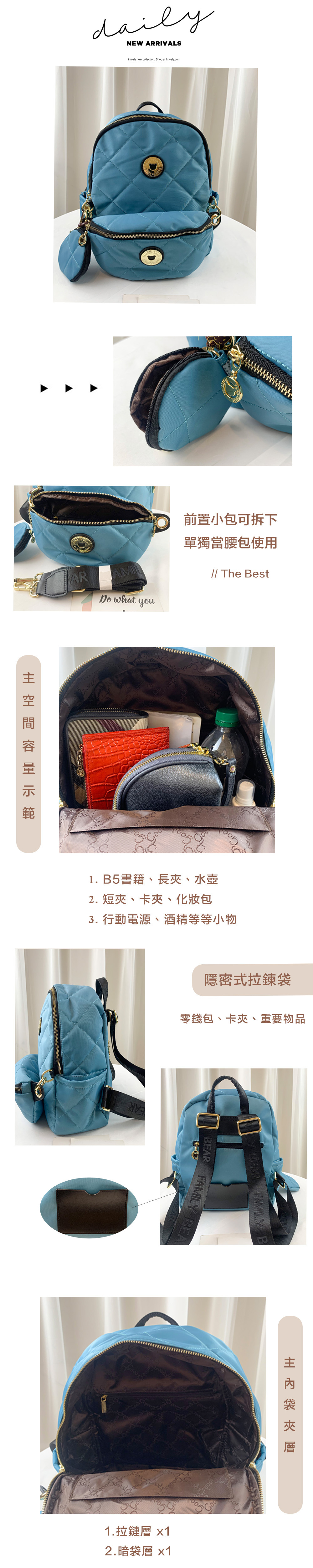 ✒︎前面小腰包可拆下單獨使用,附贈長背帶。