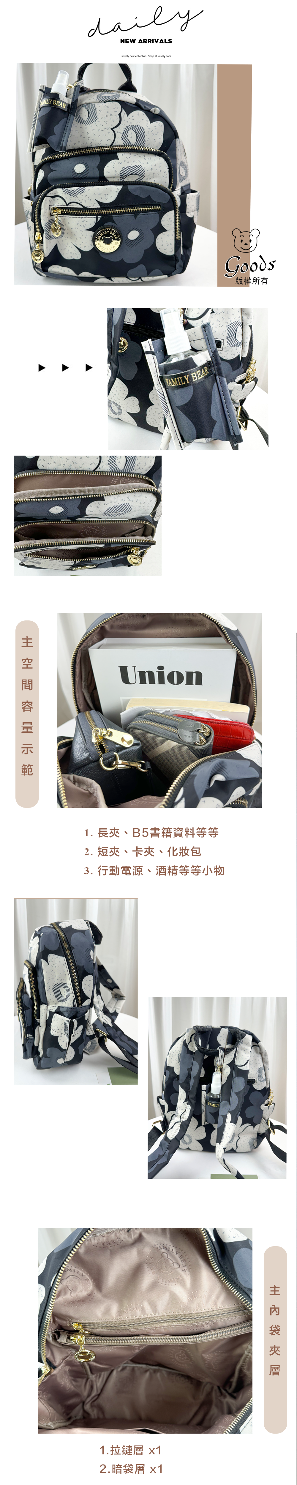 ●  規格:主空間x1  內拉鍊袋x2  暗格x1  前測拉鍊x3  後測拉鍊x1