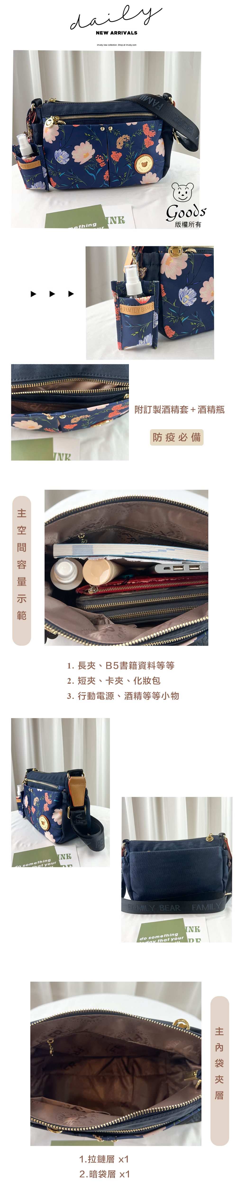 FamilyBear 藍橙花拼色防潑水側背包 附酒精保護套+酒精瓶 #2806