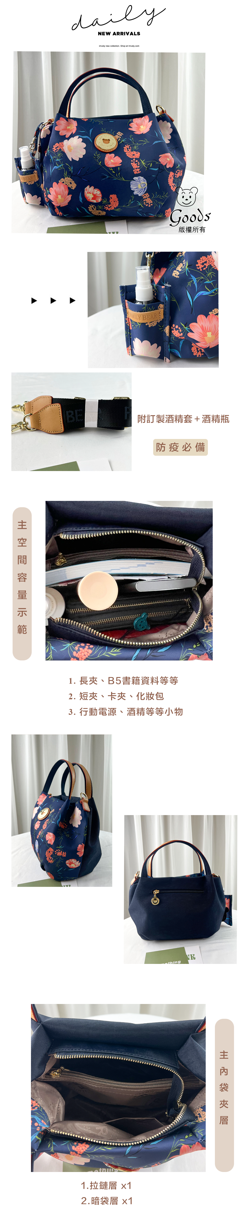 FamilyBear 藍橙花拼色防潑水手提包 / 側背包 附酒精保護套+酒精瓶 #2808