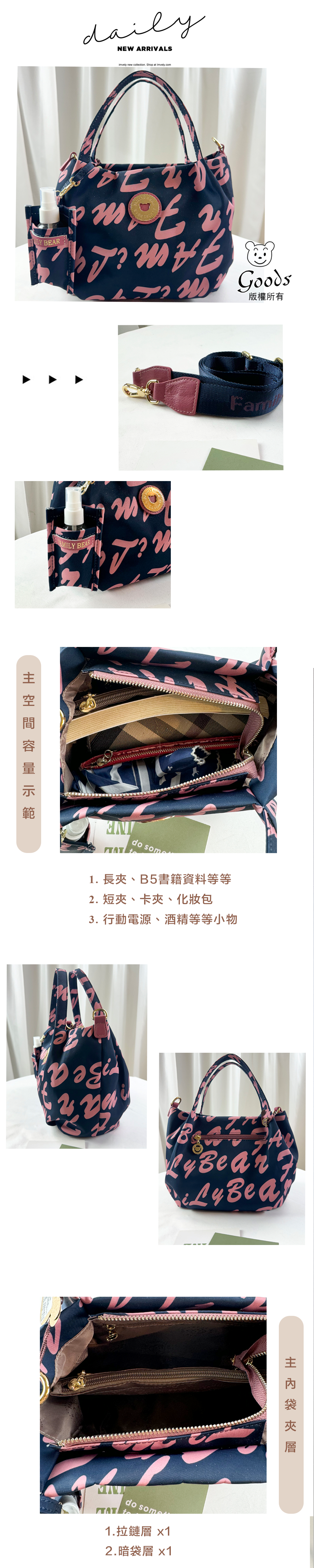 ●  規格:主空間x1  內拉鍊袋x1  暗格x1  後置拉鍊x1