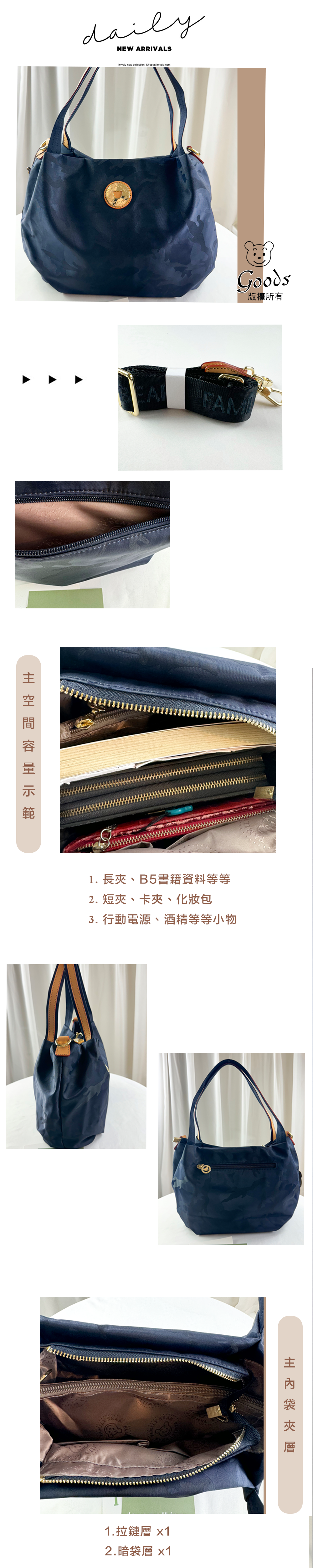 ●  規格:主空間x1  內拉鍊袋x1  暗格x1  後置拉鍊x1