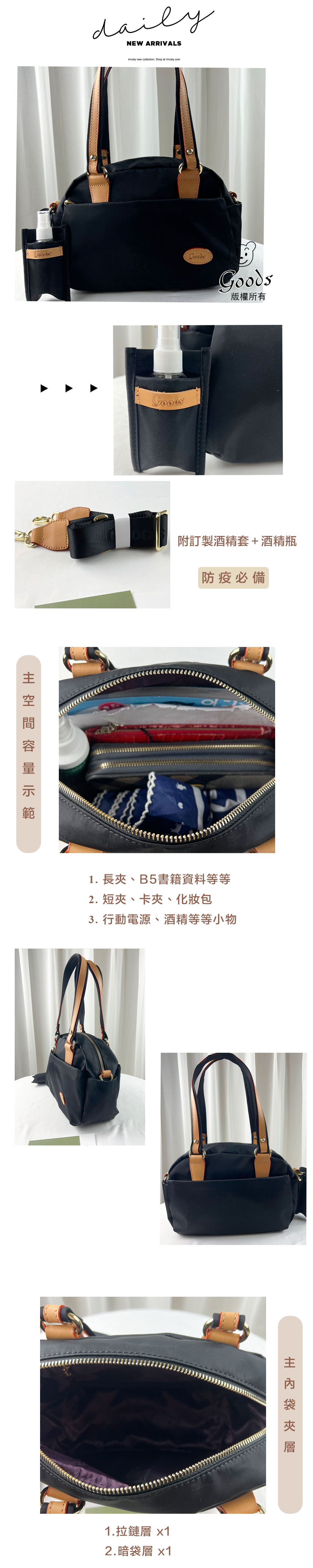 ●  規格:主空間x1  內拉鍊袋x1  暗格x1  前測拉鍊x1  後測拉鍊x1