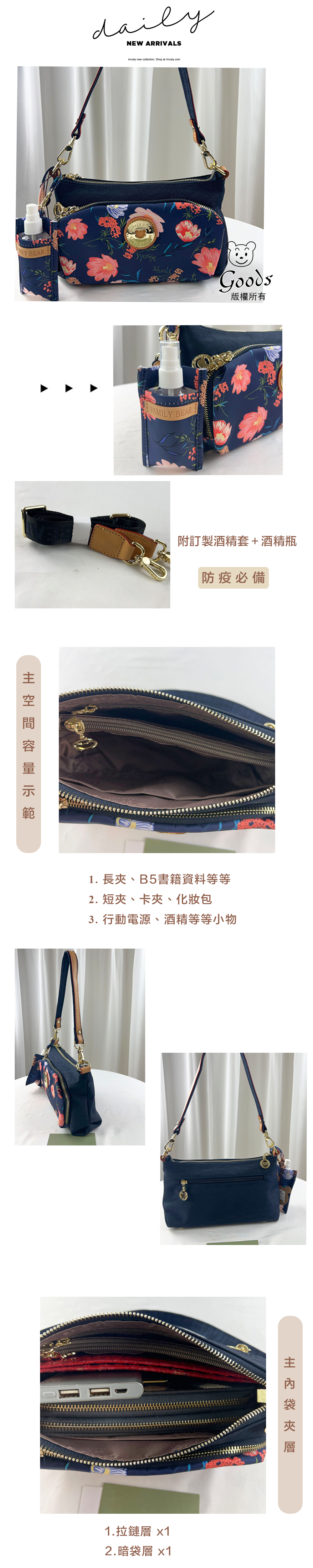 FamilyBear 藍橙花拼色防潑水肩背包 / 側背包 附酒精保護套+酒精瓶 #2813