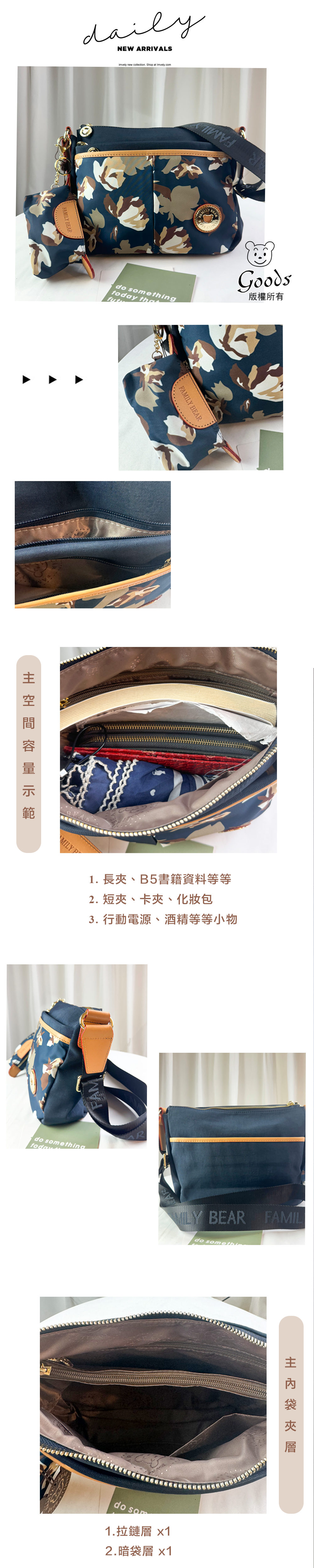 ●  規格:主空間x1  內拉鍊袋x1  暗格x1  前測拉鍊x2  後測拉鍊x1