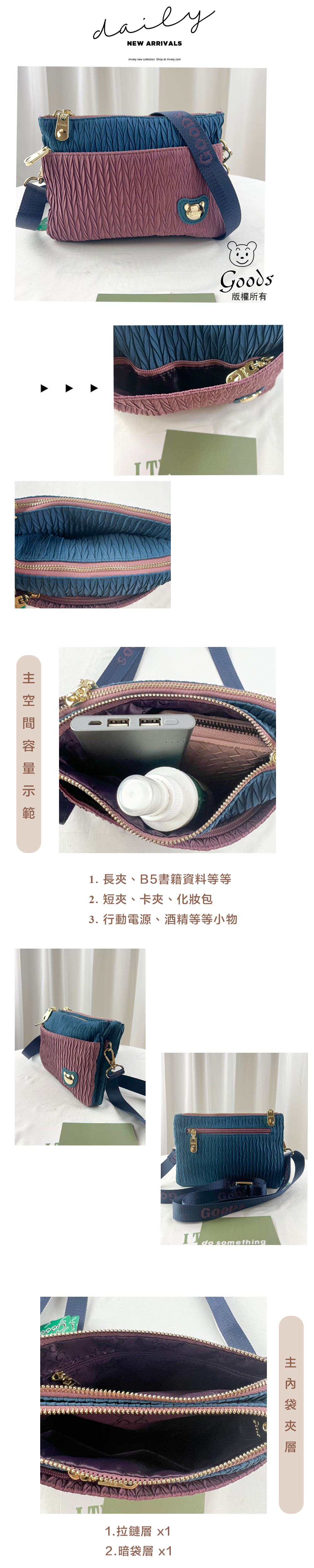 ●  規格:主空間x2  內拉鍊袋x1  暗格x1  前測拉鍊x1  後測拉鍊x1