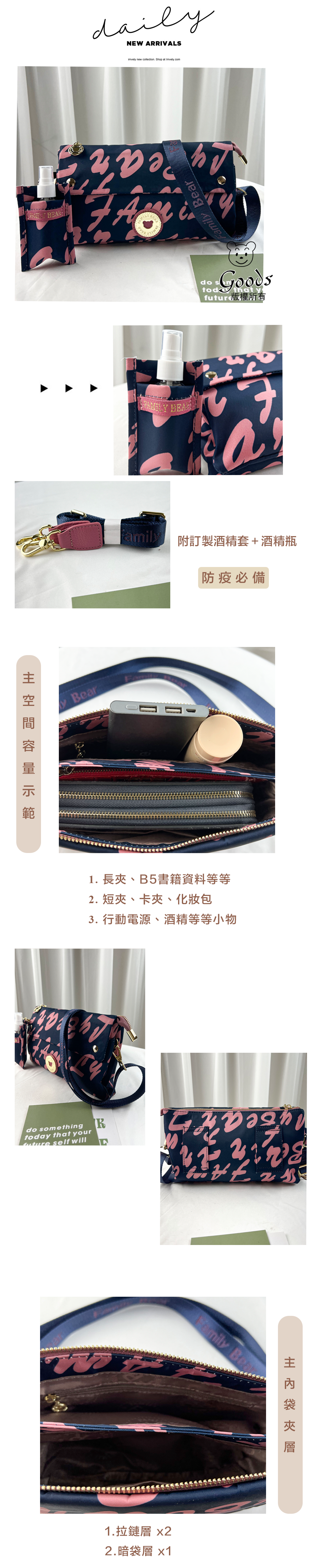 ●  規格:主空間x1  內拉鍊袋x1  暗格x1  前測拉鍊x1  後測拉鍊x1