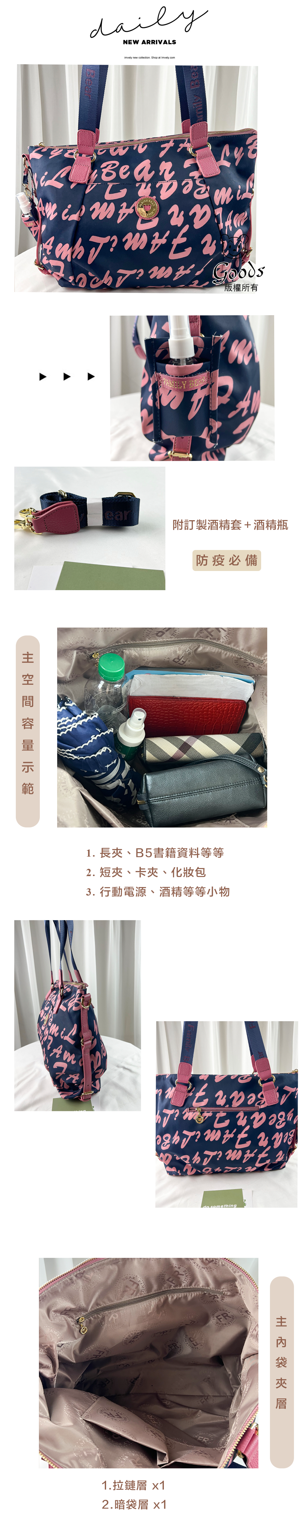 ●  規格:主空間x1  內拉鍊袋x2  暗格x1  前測拉鍊x3  後測拉鍊x1