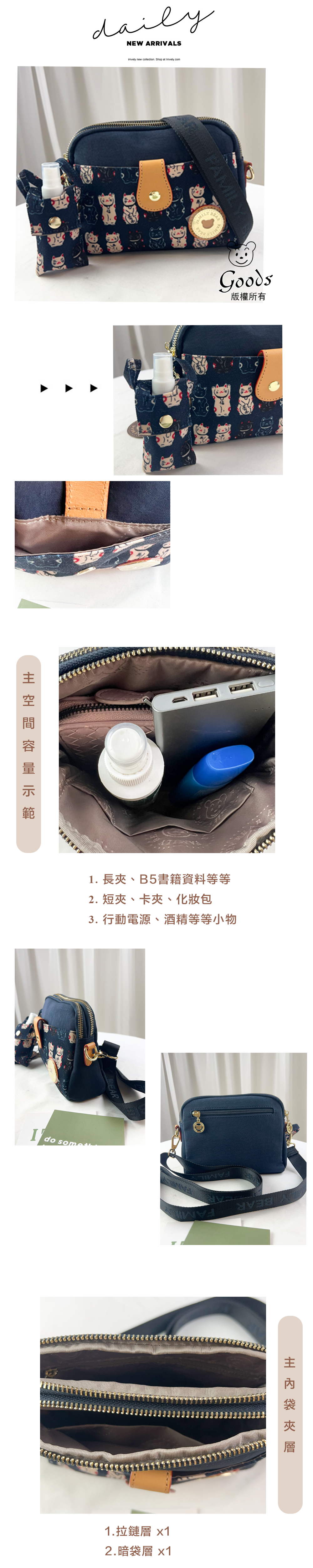 FamilyBear 招財貓拼色防潑水側背包 #2851