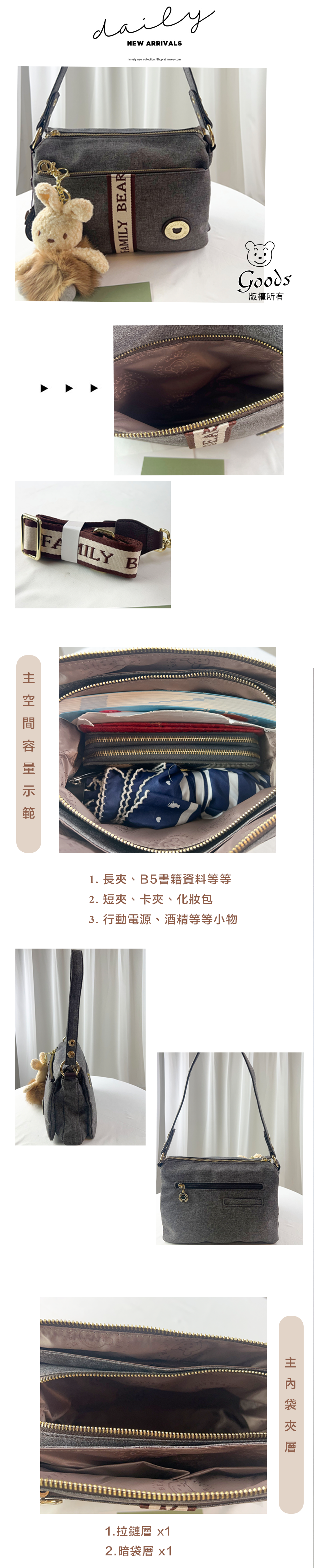 FamilyBear 織帶灰配咖防潑水肩背包 / 側背包 附兔兔吊飾 #29259
