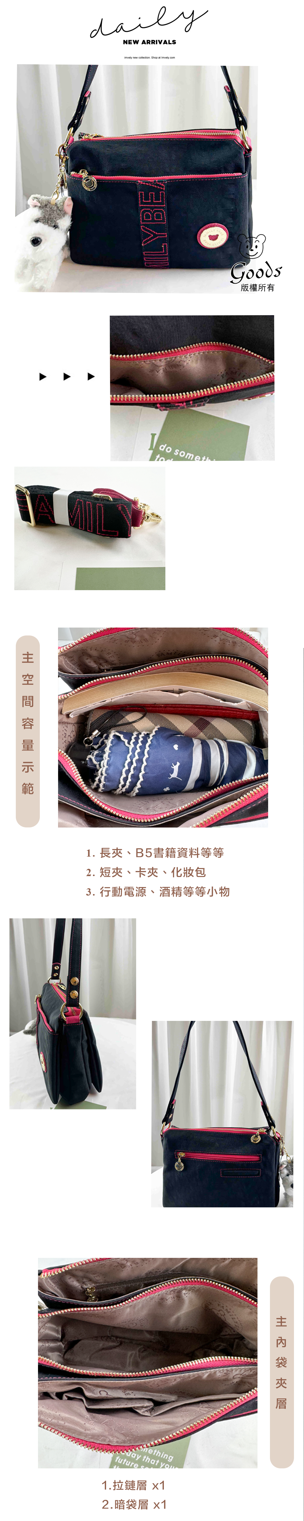 ●  規格:主空間x3  內拉鍊袋x1  暗格x2  前測拉鍊x1  後測拉鍊x1