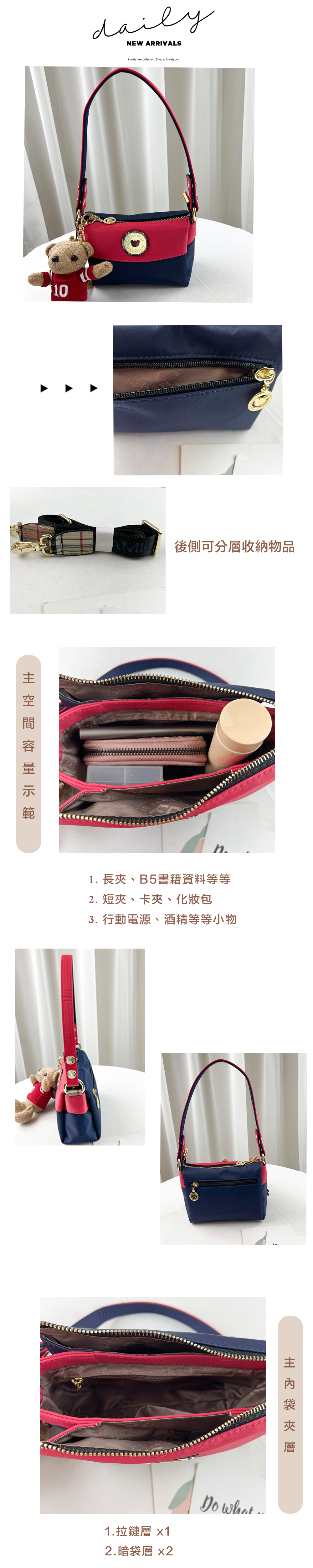 ●  規格:主空間x3  內拉鍊袋x1  暗格x1  後測拉鍊x1