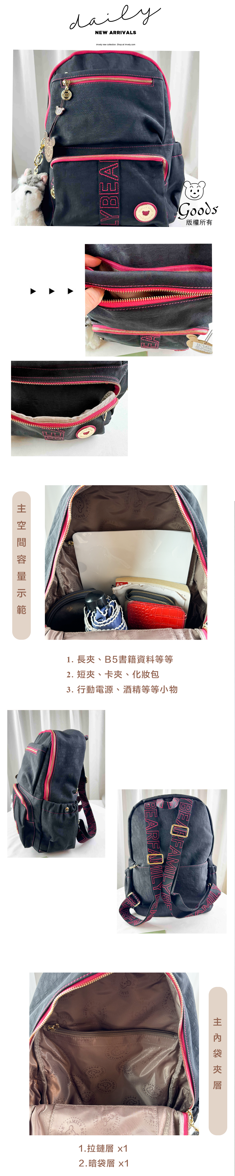 ●  規格:主空間x1  內拉鍊袋x1  暗格x1  前測拉鍊x2  後測拉鍊x1