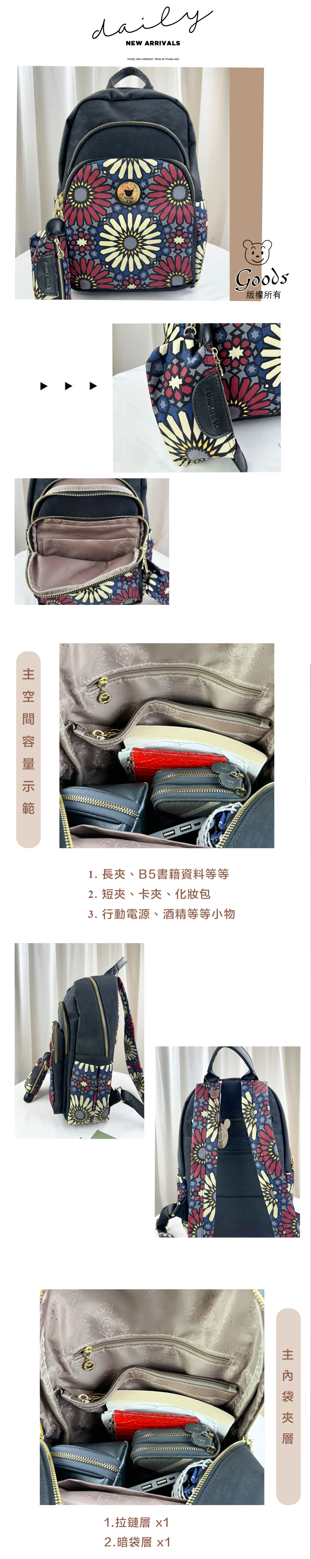 ●  規格:主空間x1  內拉鍊袋x1  暗格x1  前測拉鍊x2  後測拉鍊x1