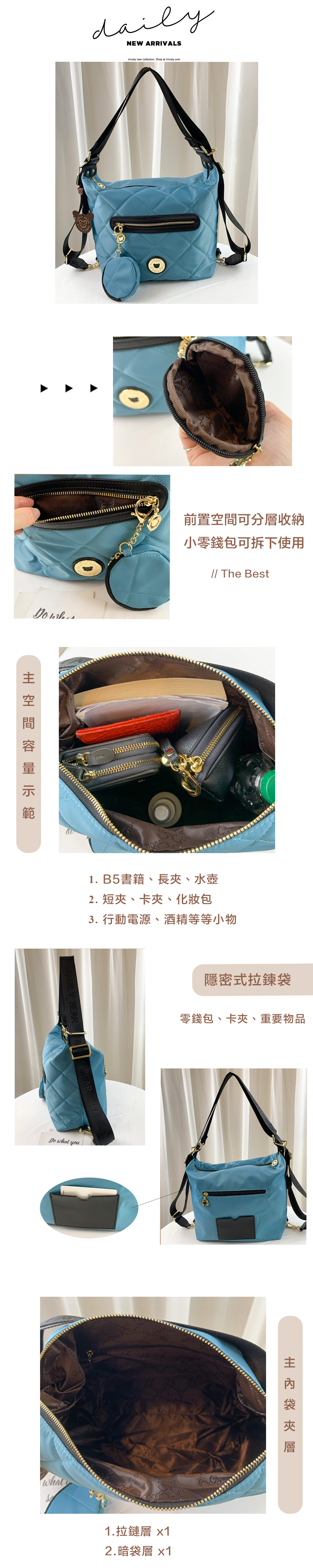●  規格:主空間x1  內拉鍊袋x1  暗格x2  前測拉鍊x1  後測拉鍊x1  後側卡夾x1