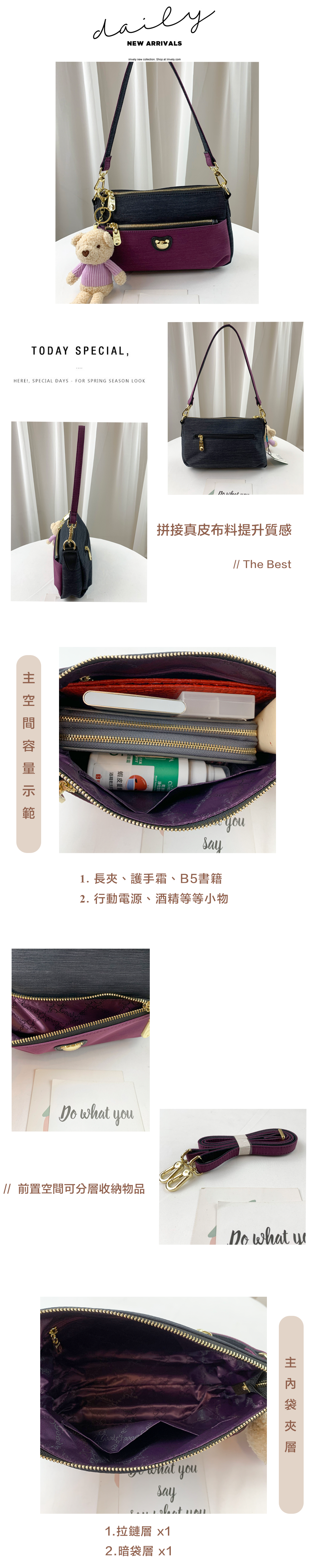 ●  規格:主空間x1  內拉鍊袋x1  暗格x1  前測拉鍊x1  後測拉鍊x1