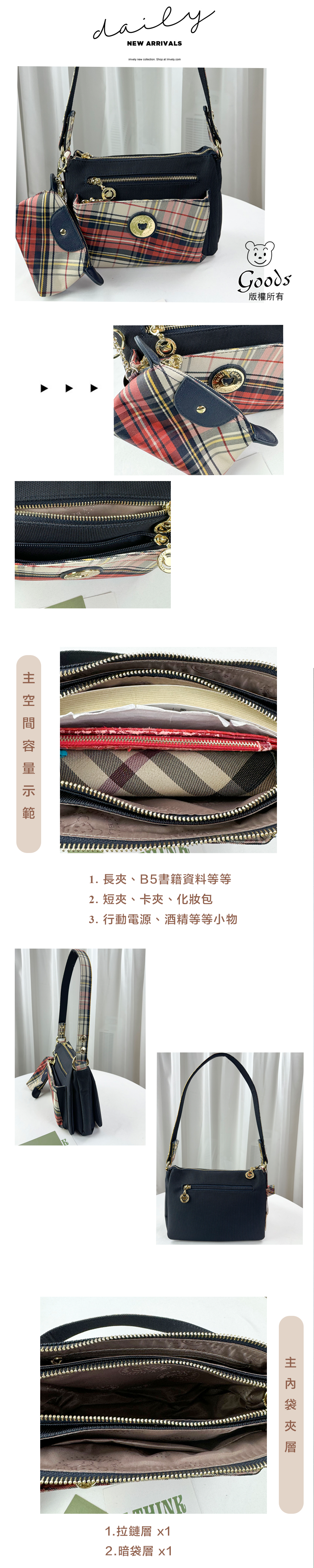 FamilyBear 橙格紋 拼色防潑水肩背包 / 側背包 附格紋零錢包 #1952