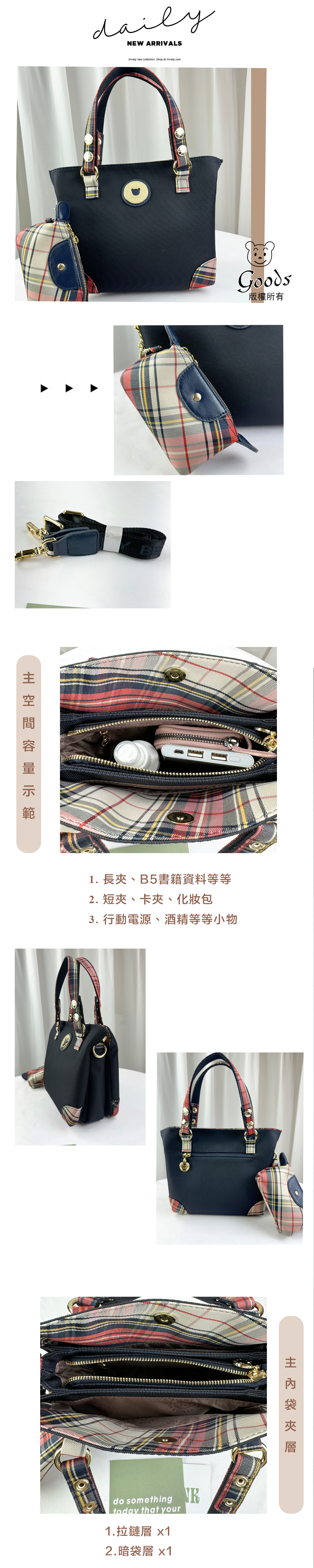 ●  規格:主空間x3  內拉鍊袋x1  暗格x1  後側拉鍊x1