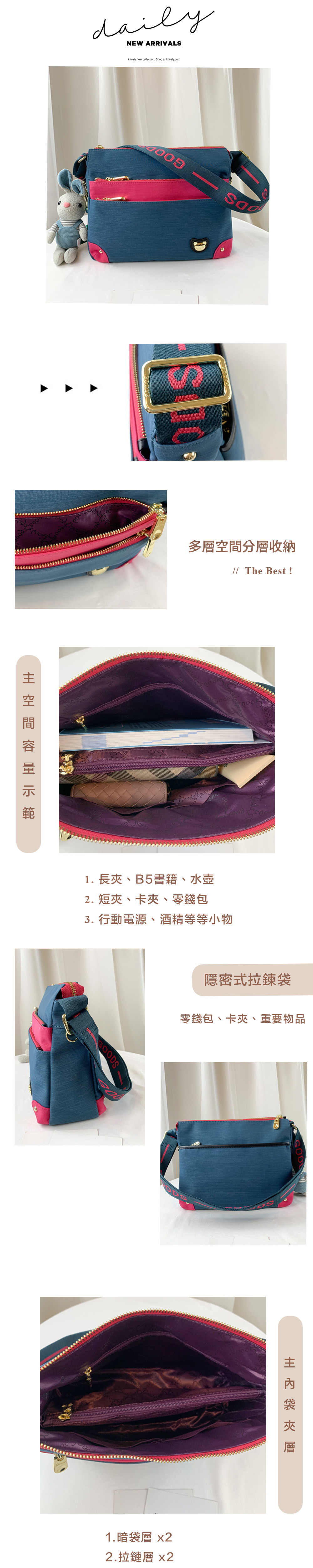 ●  規格:主空間x1  內拉鍊袋x2  暗格x2  前測拉鍊x2  後測拉鍊x1