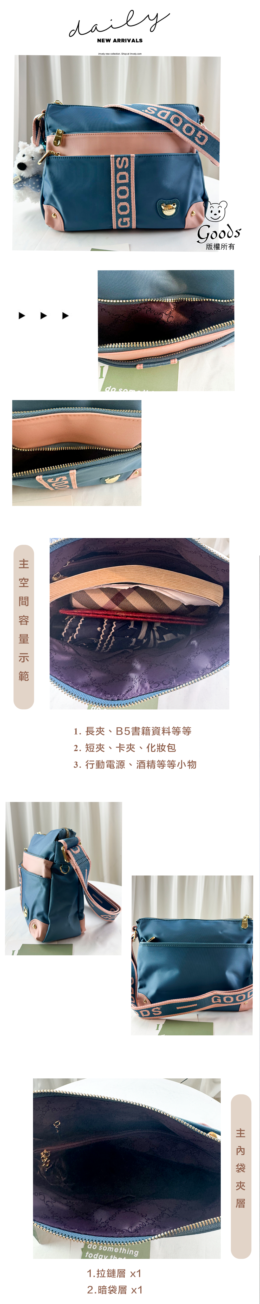 ●  規格:主空間x1  內拉鍊袋x2  暗格x2  前測拉鍊x2  後測拉鍊x1