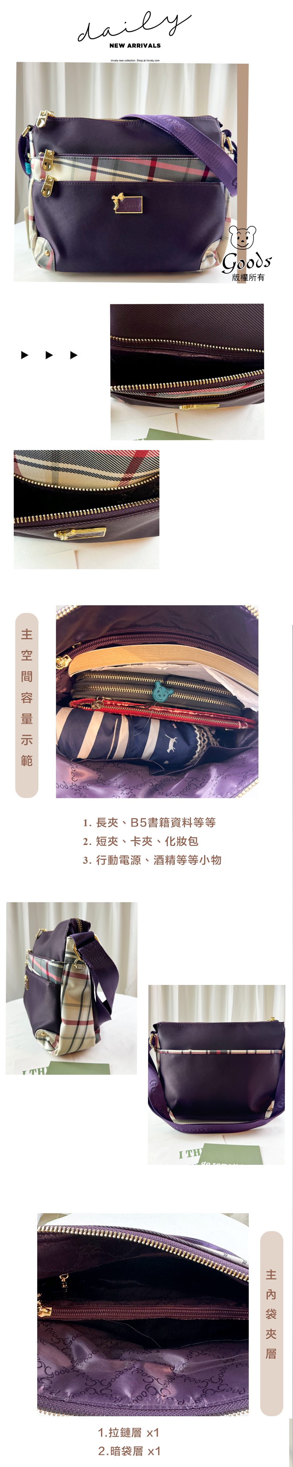 GOODS 紫格紋拼色防潑水肩背包 / 側背包 #2045