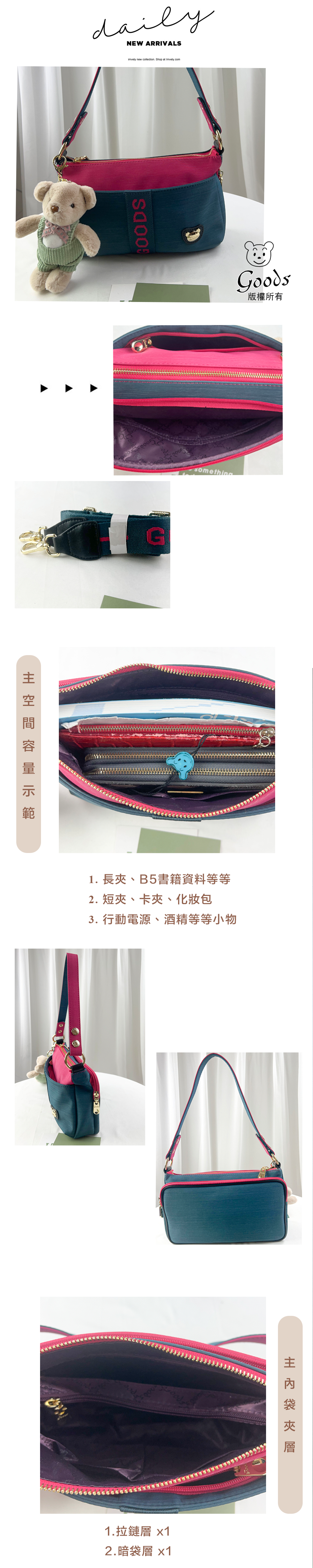 GOODS 綠桃拼色防潑水肩背包 / 側背包 附小熊吊飾 #2048