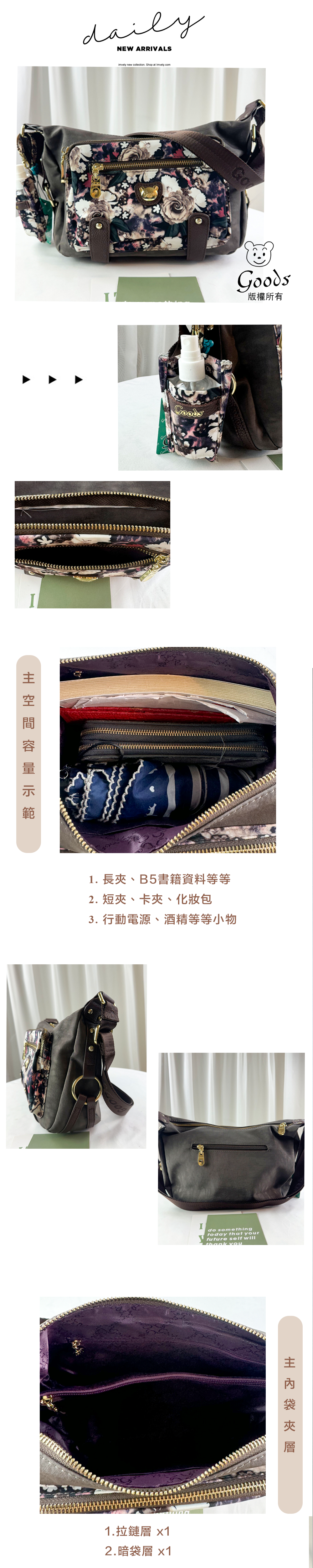 ●  規格:主空間x1  內拉鍊袋x2  暗格x2  前測拉鍊x2  後測拉鍊x1