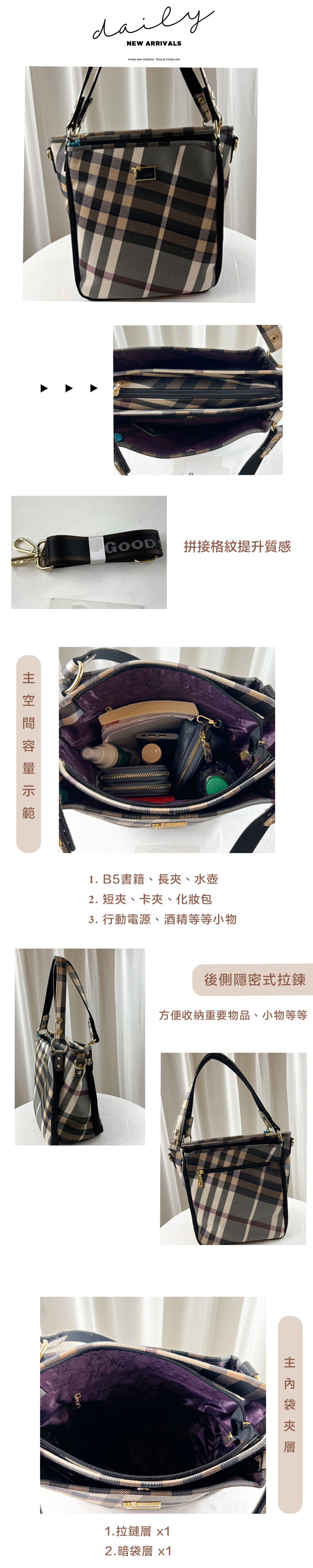 ●  規格:主空間x3  內拉鍊袋x1  暗格x1  後層拉鍊x1