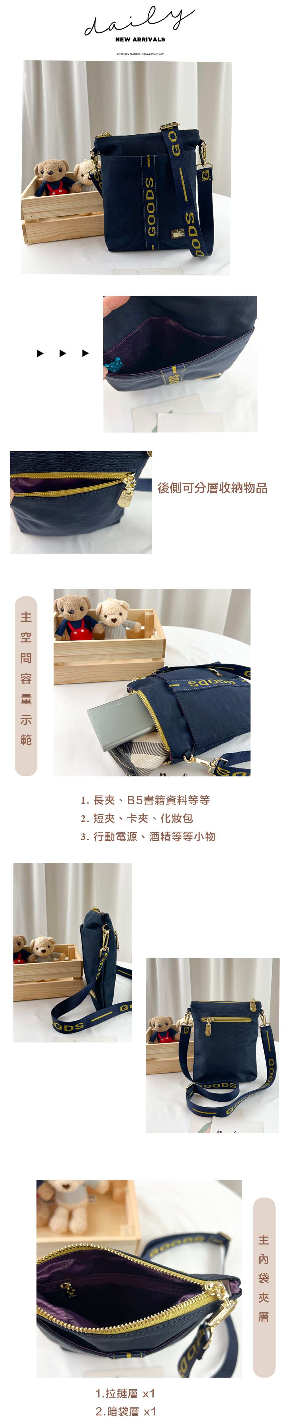 ●  規格:主空間x1  內拉鍊袋x1  暗格x1  前測收納x1  後測拉鍊x1