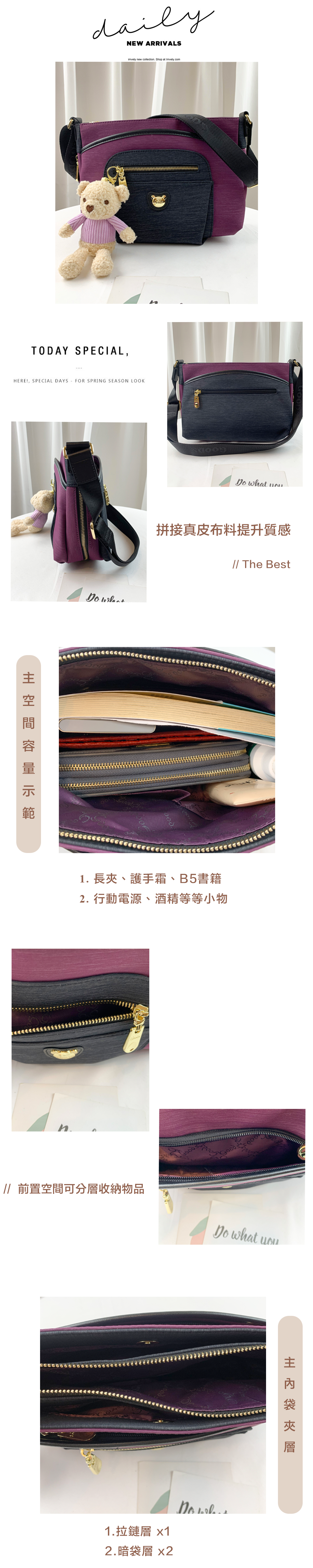 ●  規格:主空間x1  內拉鍊袋x1  暗格x2  前測拉鍊x2  後測拉鍊x2