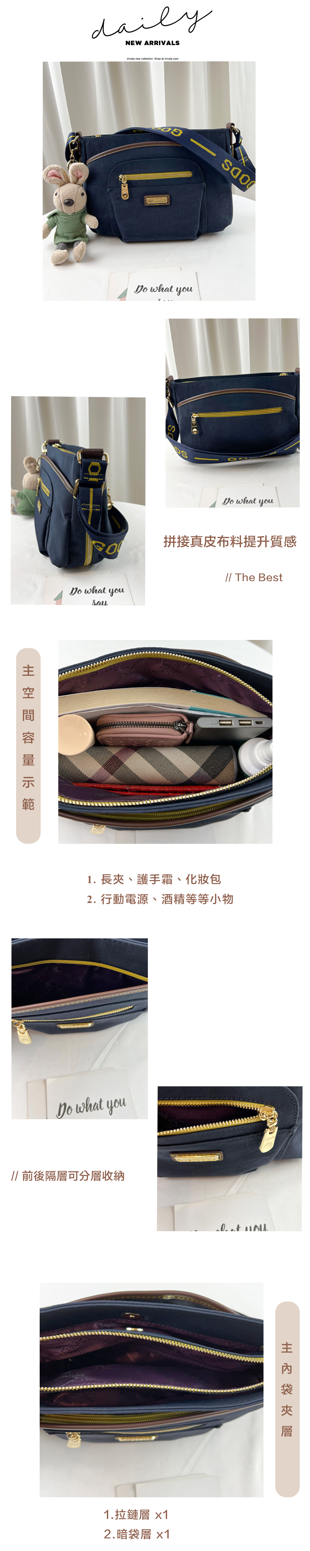 ●  規格:主空間x1  內拉鍊袋x1  暗格x2  前測拉鍊x2  後測拉鍊x2